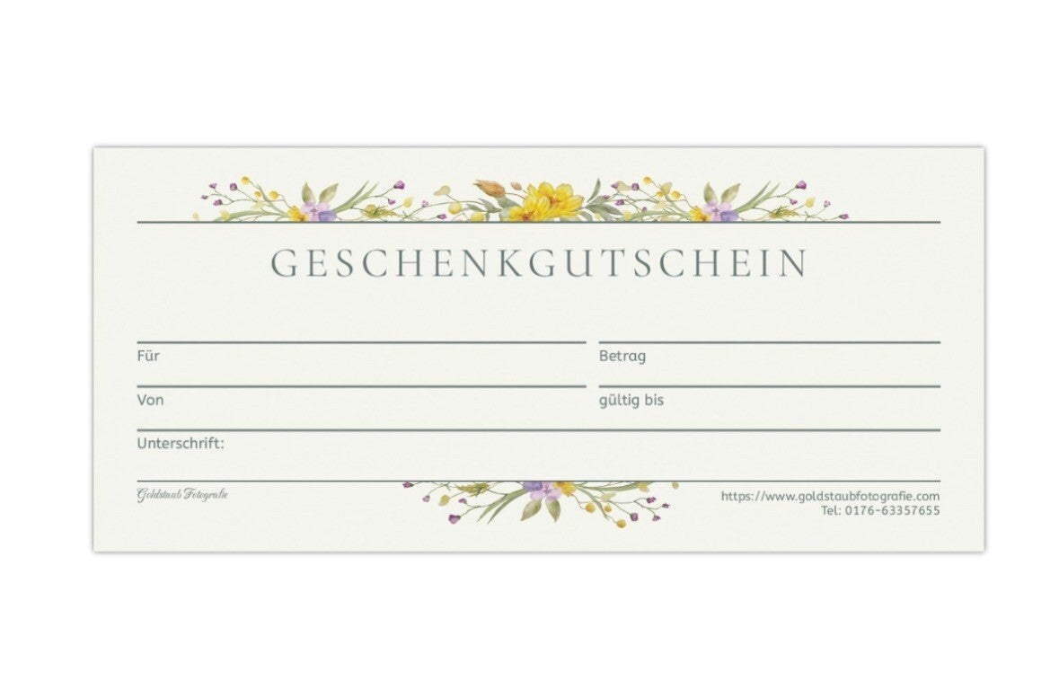 Überrasche deine Liebsten mit einem besonderen Geschenk: Einem Gutschein für ein unvergessliches Fotoshooting bei Goldstaub Fotografie. Halte einzigartige Momente fest und schenke Erinnerungen, die ein Leben lang Freude bereiten.